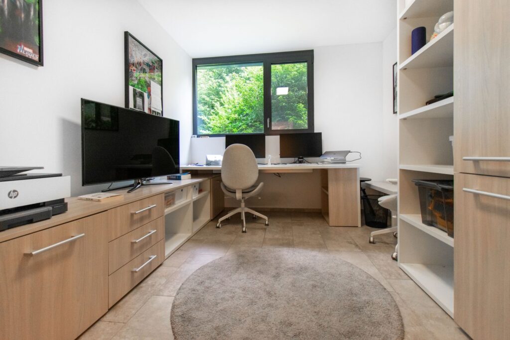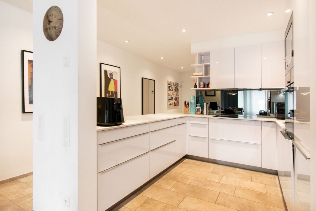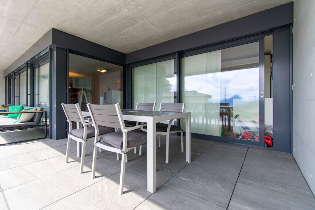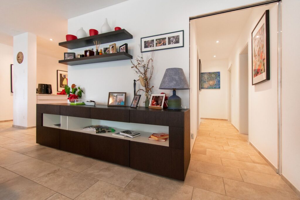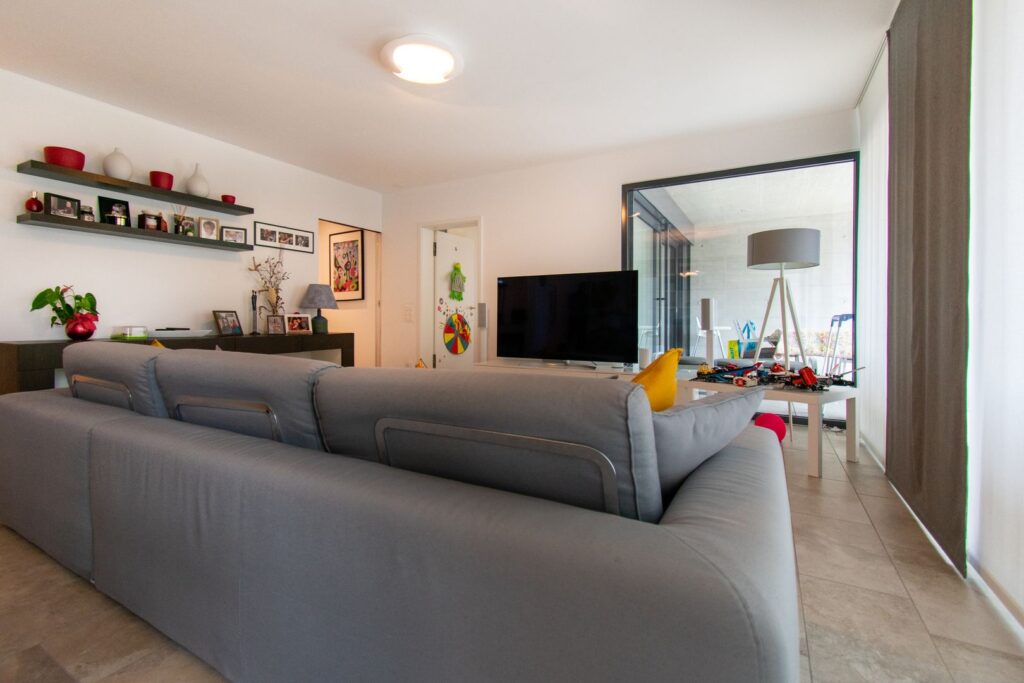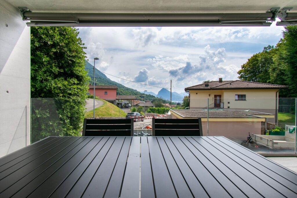 L’abitazione si trova al primo piano di una palazzina recente e ben curata, e si distingue per spazi generosi, grande luminosità e finiture moderne. L’ingresso conduce a un accogliente soggiorno con accesso diretto alla terrazza coperta di circa 28 mq con vista sul paesaggio circostante fino al lago di Lugano. La cucina, a vista e completamente attrezzata, si integra perfettamente con lo stile contemporaneo dell’appartamento.