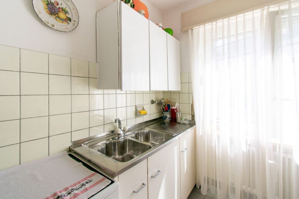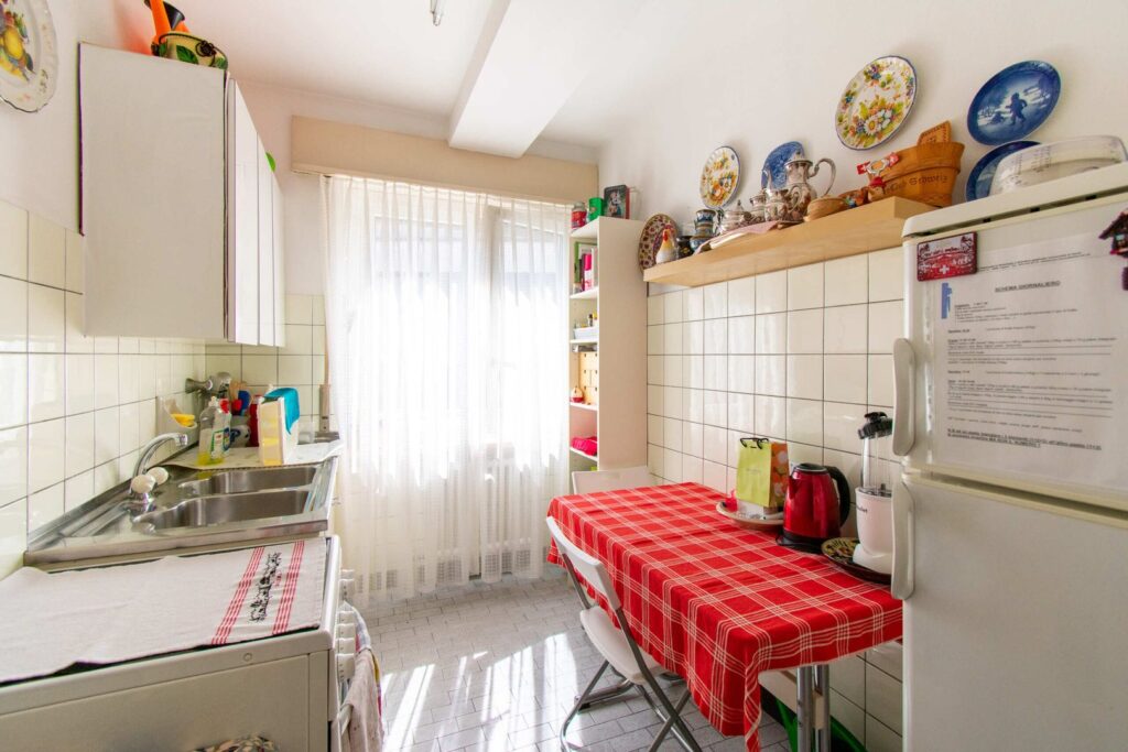 La zona giorno accoglie un soggiorno ampio e ben esposto, valorizzato da grandi superfici vetrate che conducono all’esterno, dove si sviluppa un gradevole balcone a L con vista, ideale per momenti di relax. La cucina, separata e finestrata, è pratica e ben organizzata, con interessante potenziale di rinnovamento.
