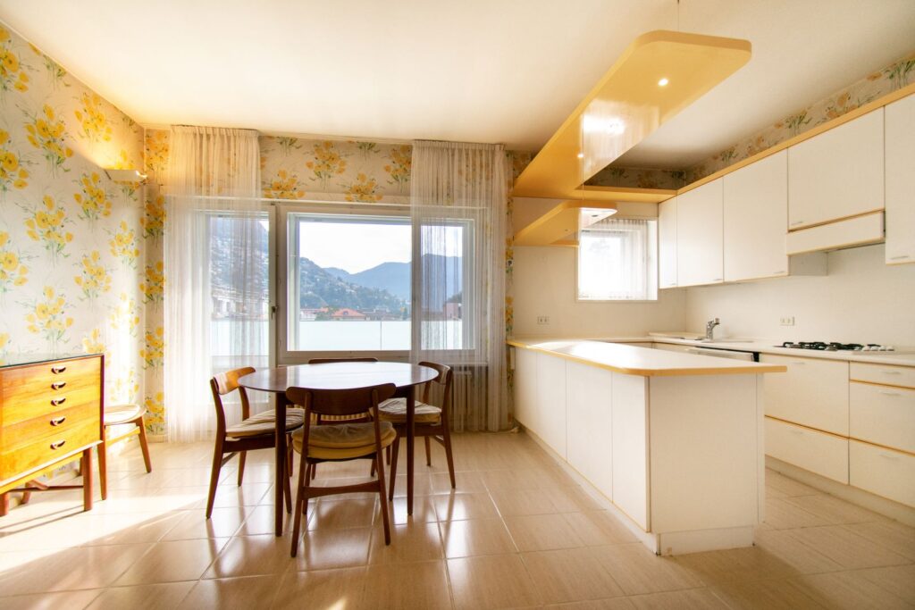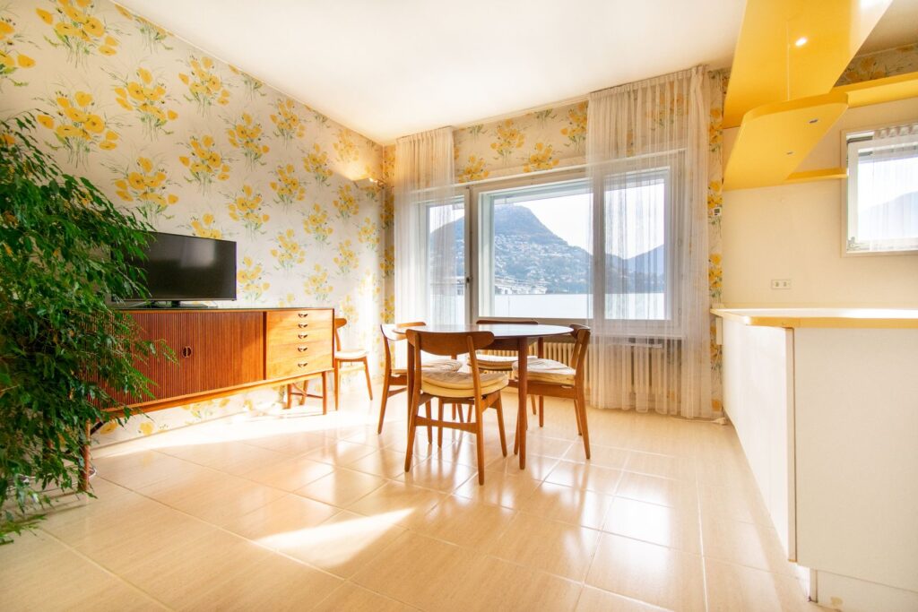 La cucina abitabile colpisce per le sue generose dimensioni, che offrono un senso di spazio raro da trovare. Una portafinestra dà accesso al balcone e regala una bellissima vista aperta sulla città e sul Monte Brè.
