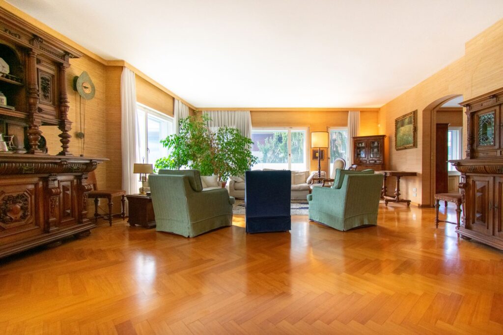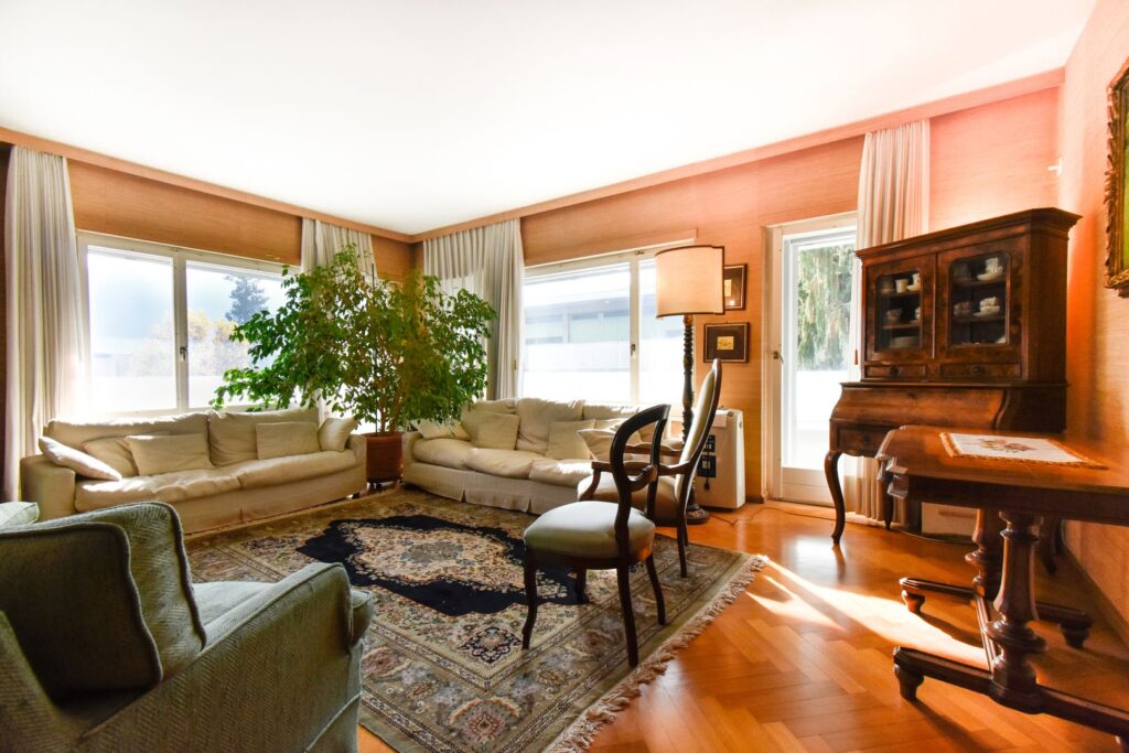 Dopo aver varcato la soglia di ingresso, si viene accolti dalla zona living, che rappresenta il fulcro della casa. Composto da soggiorno e zona pranzo, questo ampio ambiente è caratterizzato da numerose finestre che inondano lo spazio di luce naturale, esaltando il calore dei pavimenti in parquet a spina di pesce.