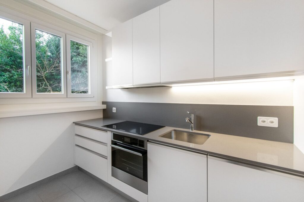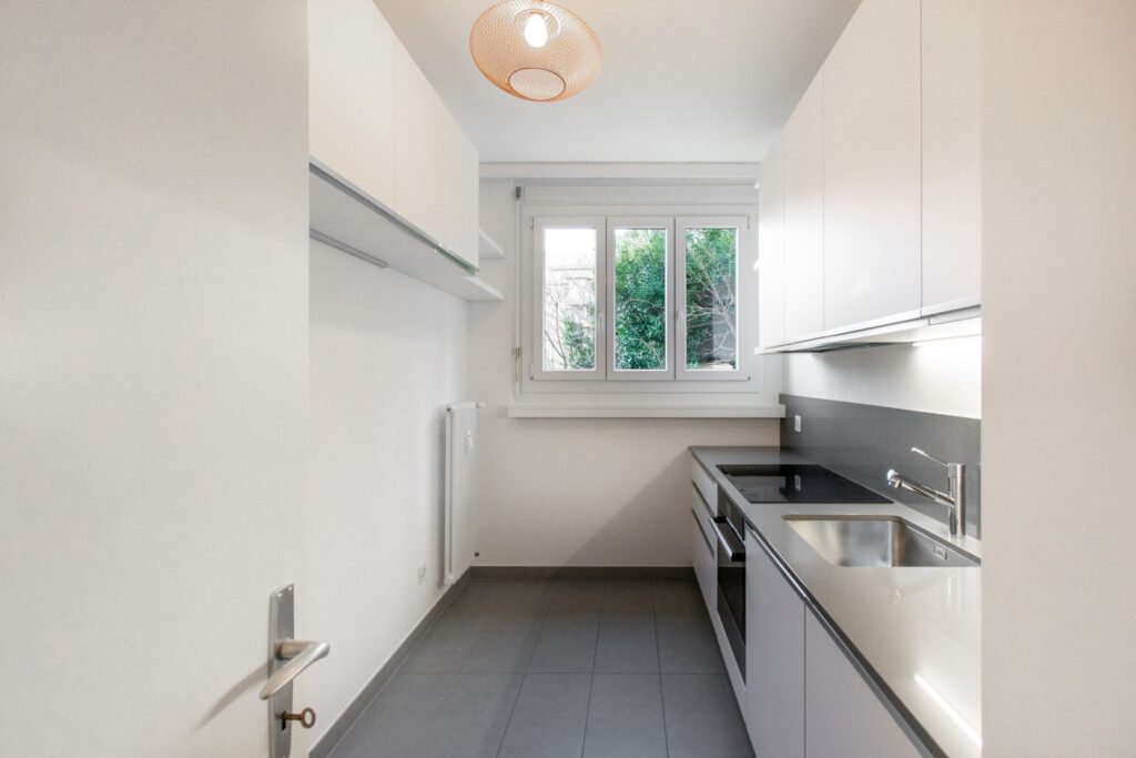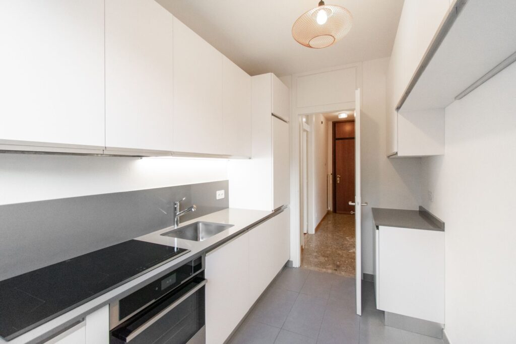 La zona giorno è composta da un soggiorno con area pranzo, reso particolarmente piacevole dall’accesso al balcone vista lago. La cucina, separata, si inserisce in modo armonioso nella distribuzione dell’appartamento.