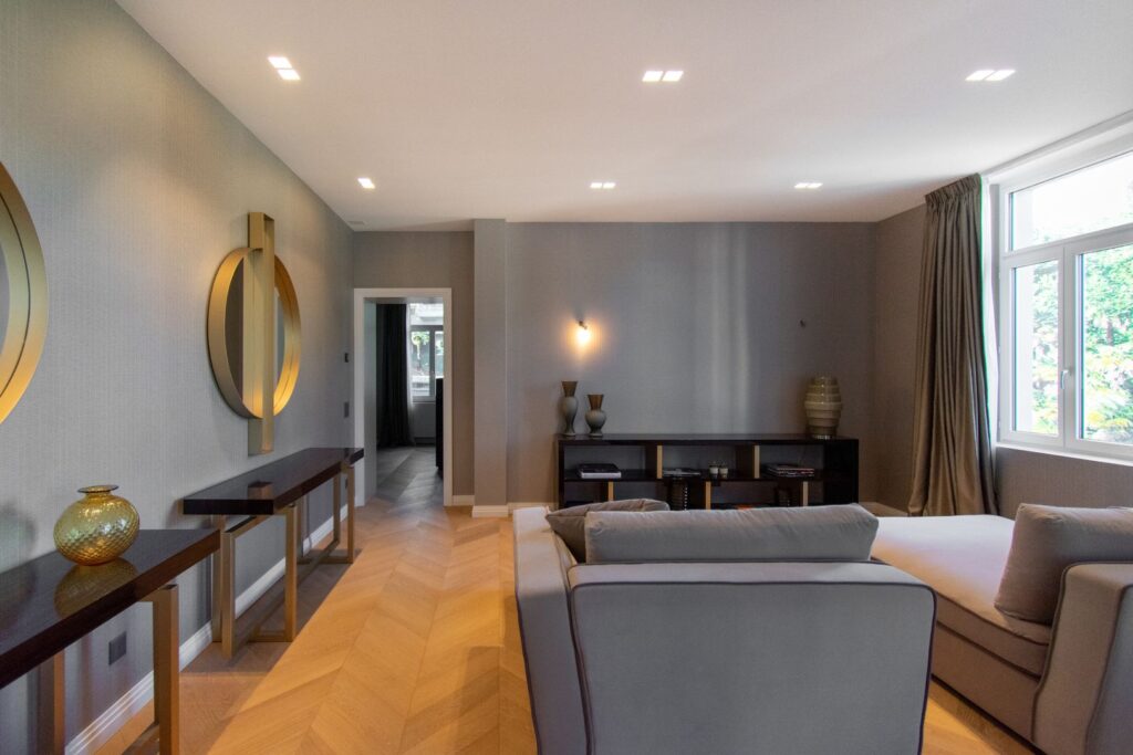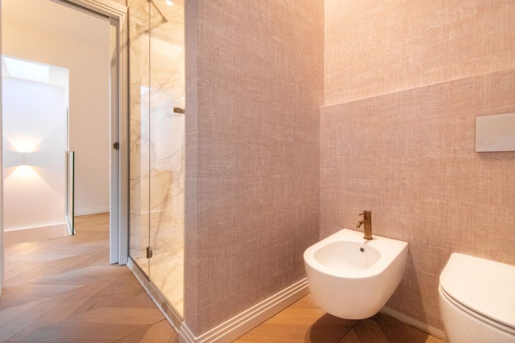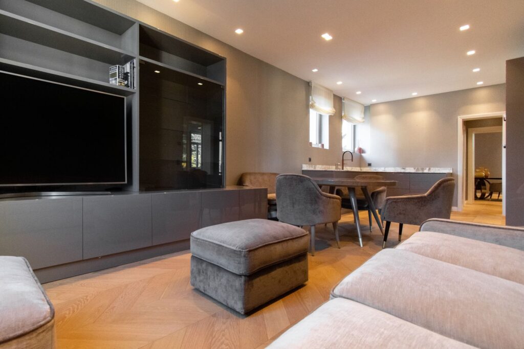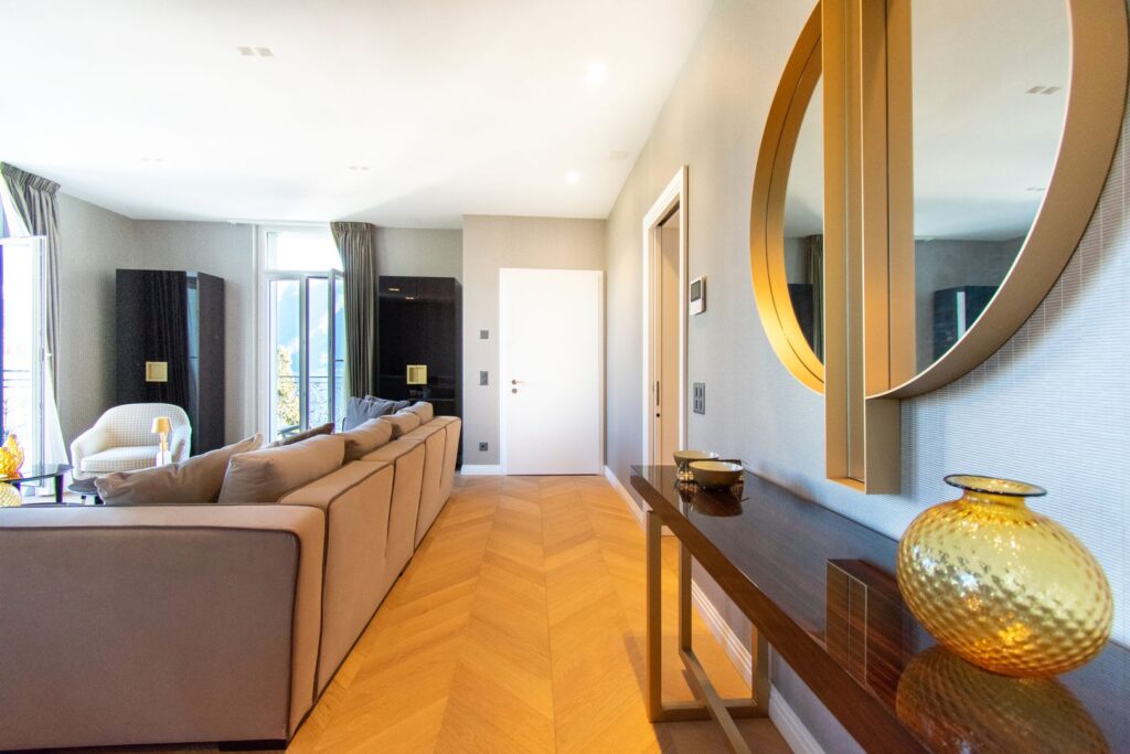 L’ascensore privato si apre su un living che incanta al primo sguardo. Qui, la luce naturale danza tra le linee eleganti degli arredi e si riflette nei dettagli più pregiati, come il pavimento in parquet a lisca di pesce che crea un’atmosfera calda e avvolgente. Il soggiorno è arricchito da un balcone che regala scorci sul lago, mentre il secondo living, con grande cucina a vista in marmo, armadi su misura e sala da pranzo separata, diventa il palcoscenico perfetto per serate esclusive.