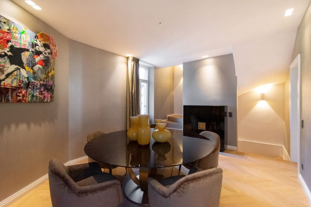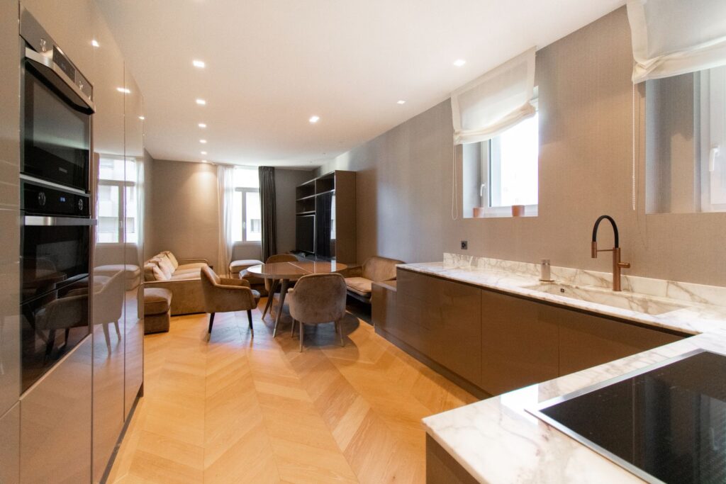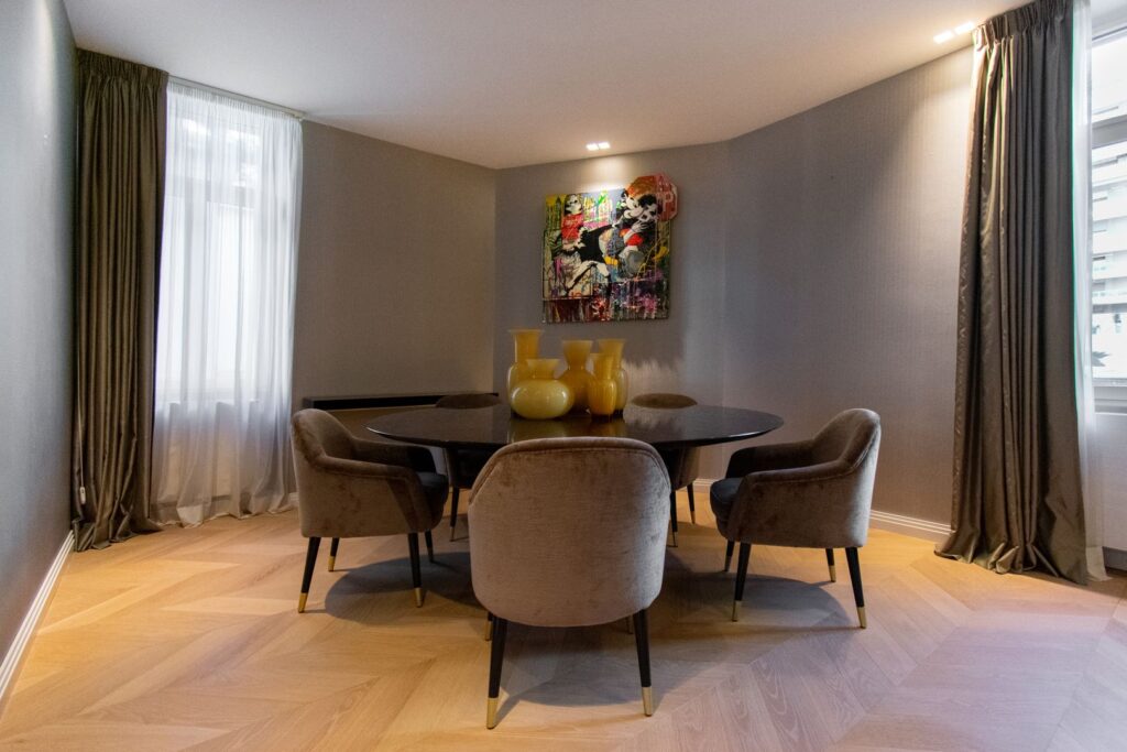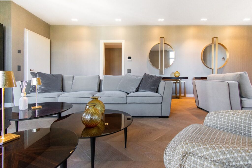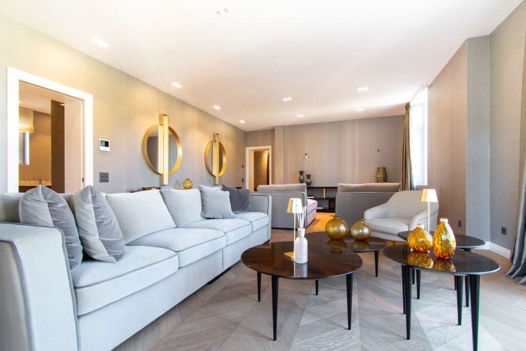 L’ascensore privato si apre su un living che incanta al primo sguardo. Qui, la luce naturale danza tra le linee eleganti degli arredi e si riflette nei dettagli più pregiati, come il pavimento in parquet a lisca di pesce che crea un’atmosfera calda e avvolgente. Il soggiorno è arricchito da un balcone che regala scorci sul lago, mentre il secondo living, con grande cucina a vista in marmo, armadi su misura e sala da pranzo separata, diventa il palcoscenico perfetto per serate esclusive.