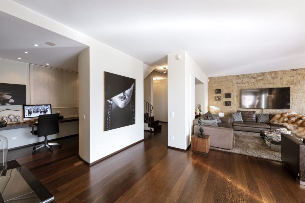 Luminosissimo grazie all’esposizione verso sud e alle grandi vetrate panoramiche, ha una superficie commerciale di circa 265 mq e si sviluppa su due piani.