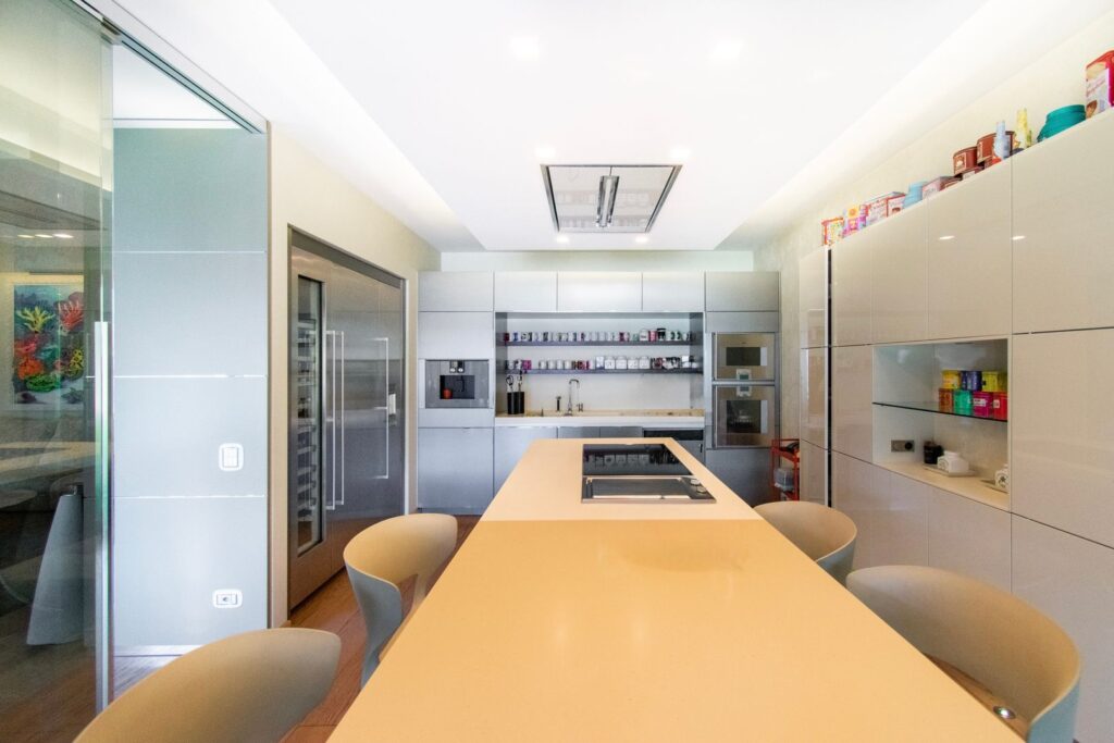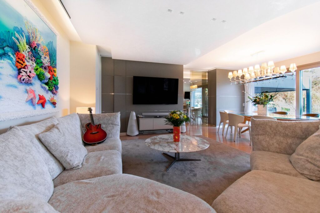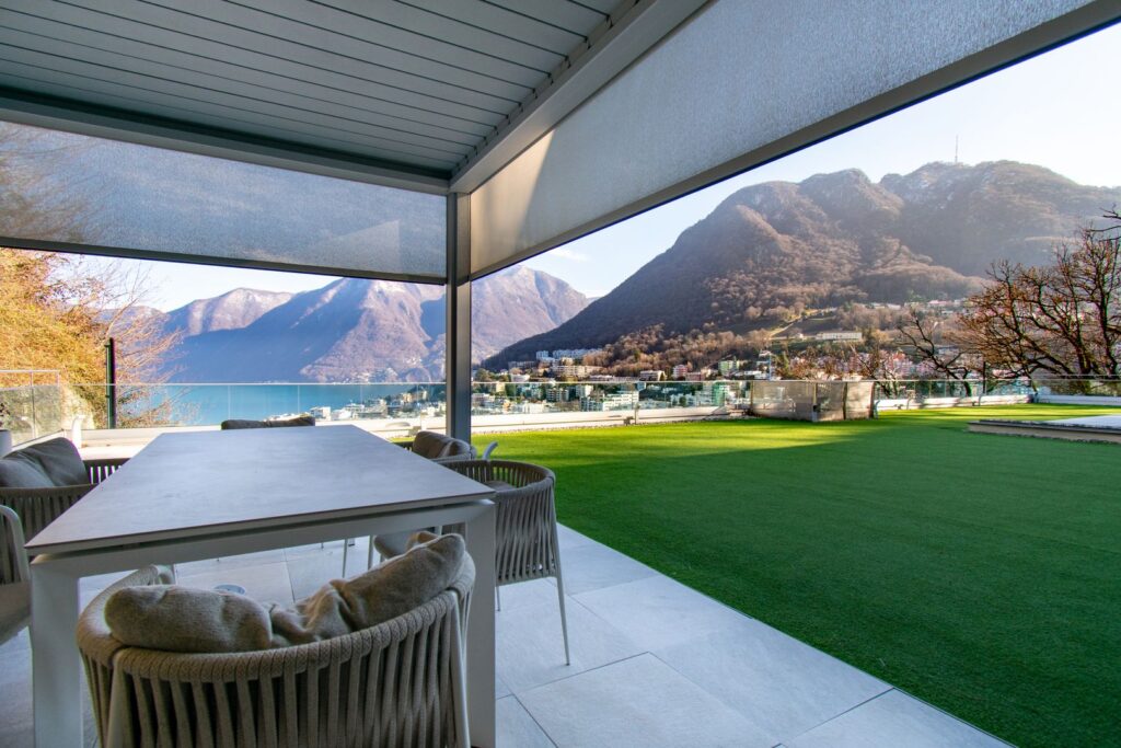 La zona living ospita il soggiorno, l’area pranzo e la cucina di design con isola centrale, dalla quale si accede direttamente all’outdoor panoramico, in naturale continuità con la vista aperta sulla città e sul lago. La piscina si inserisce con equilibrio in questo contesto, completando l’area esterna e rafforzando il carattere esclusivo della proprietà.