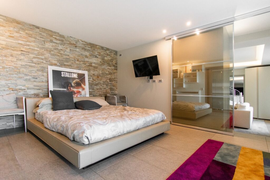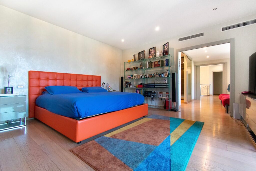 Il piano superiore è interamente dedicato alla zona notte, dove troviamo un’ampia zona master composta da camera, ampia cabina armadio e suggestivo bagno dotato di doccia e vasca freestanding, posizionata davanti alle ampie vetrate per godere appieno del panorama. Sullo stesso piano troviamo altre tre camere da letto, due bagni e un’ampia zona armadi.