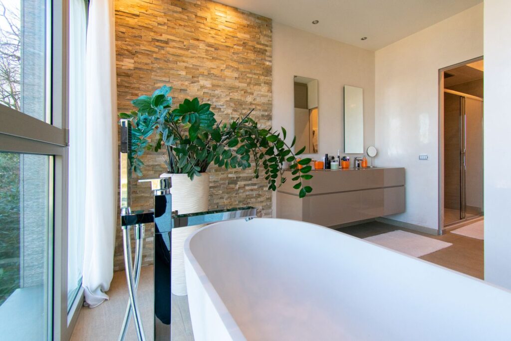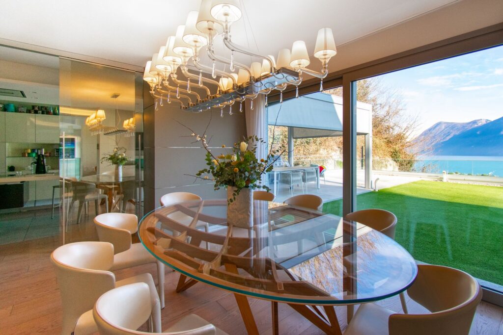 Il cuore della villa si sviluppa al piano principale, dove prende forma una zona giorno ampia e luminosa, valorizzata da grandi vetrate a tutta altezza che mettono in relazione diretta gli spazi interni con quelli esterni.