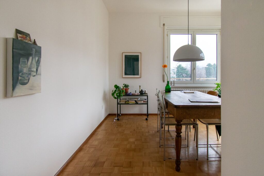 La zona giorno accoglie un soggiorno piacevole e ben illuminato, con accesso diretto a un balcone a forma di L, fruibile sia dal salotto sia dalla sala da pranzo, due ambienti distinti ma armoniosamente collegati, ideale come naturale estensione dello spazio abitativo. La cucina, separata e dotata di finestra, risulta compatta ma pratica nell’utilizzo quotidiano.
