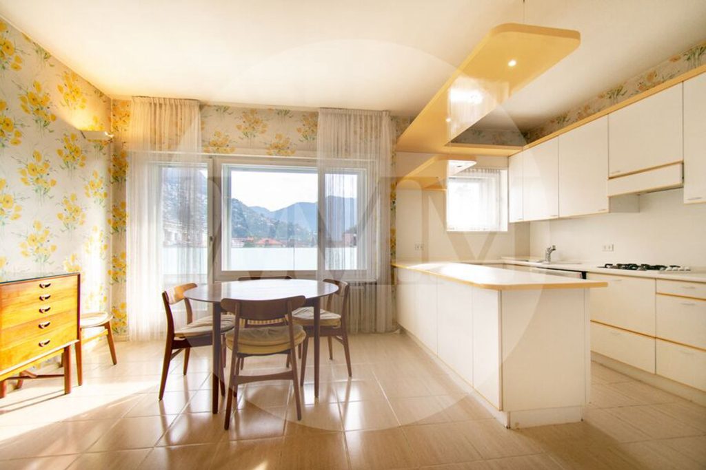 La cucina abitabile colpisce per le sue generose dimensioni, che offrono un senso di spazio raro da trovare. Una portafinestra dà accesso al balcone e regala una bellissima vista aperta sulla città e sul Monte Brè.